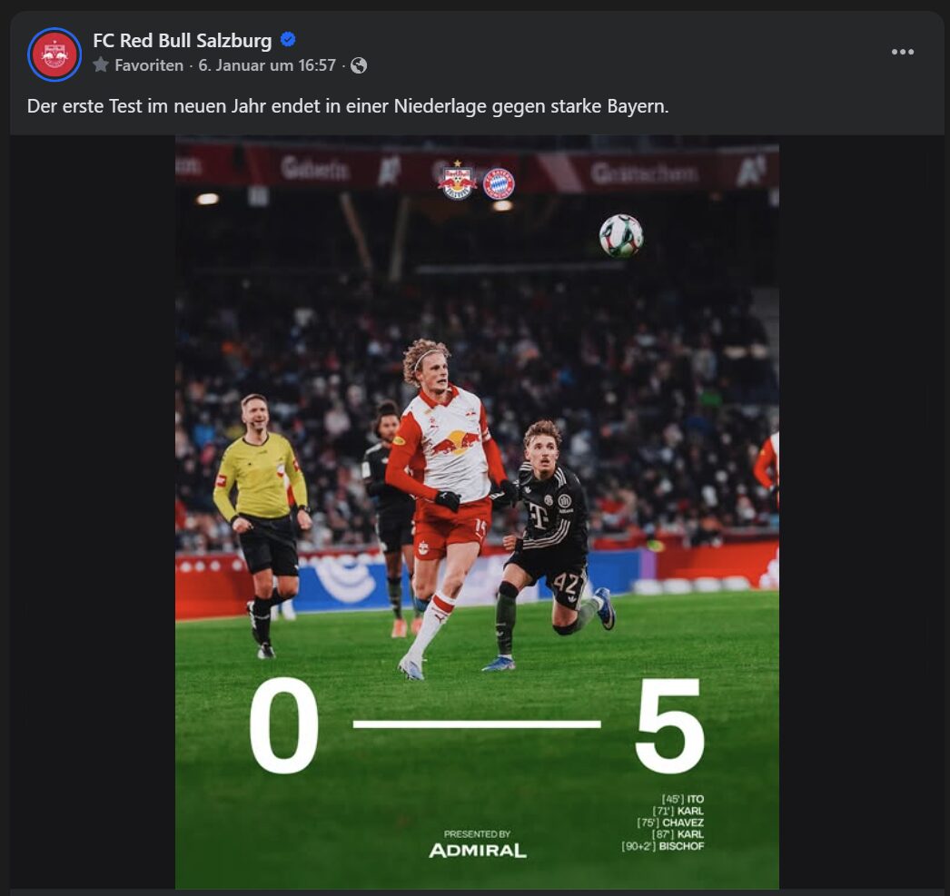 Klare Niederlage gegen starke Bayern: Salzburg hat phasenweise gezeigt, dass Intensität und Mut da sind – aber sobald Bayern das Tempo anzieht, sieht man den Unterschied in Rhythmus, Präzision und Entscheidungsfindung. Das ist kein Drama in einem Testspiel. Aber es ist ein klarer Hinweis, woran gearbeitet werden muss: saubere Abläufe im Pressing, schnelleres Umschalten, mehr Klarheit im letzten Drittel.
